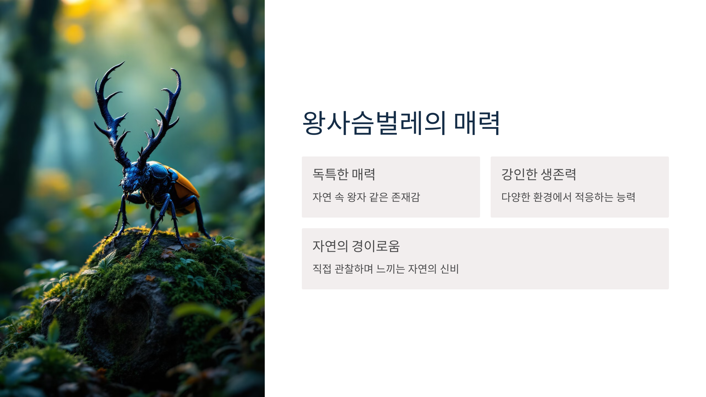 왕사슴벌레는 자연 속의 왕자처럼 독특한 매력과 강인한 생존력을 가진 곤충입니다. 🪲💪 숲속에서 발견하거나 직접 사육하며, 자연의 경이로움을 느껴보세요! 😊